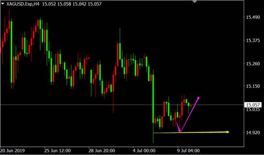 从白银4小时图来看,价格下跌末期出现锤子线平头底看涨K线形态,底部夯实已定,反弹行情即将展开。