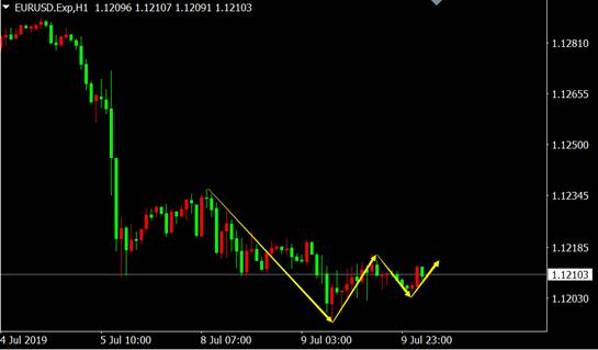 从欧元兑美元1小时图来看,价格下跌末期出现W底看涨K线形态,反弹行情即将展开,空单应考虑逢低获利了结。