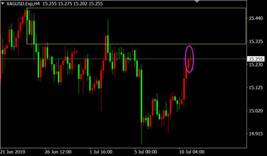 从白银4小时图来看,价格上涨至前期压力区附近出现十字星K线上涨乏力,多单应考虑及时获利了结。