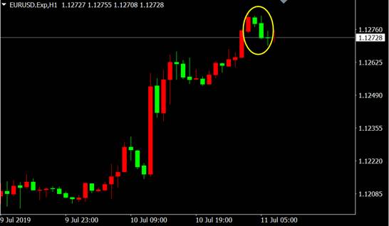 从欧元兑美元1小时图来看,价格上行末期出现看跌三连阴K线形态,多头行情将终结。