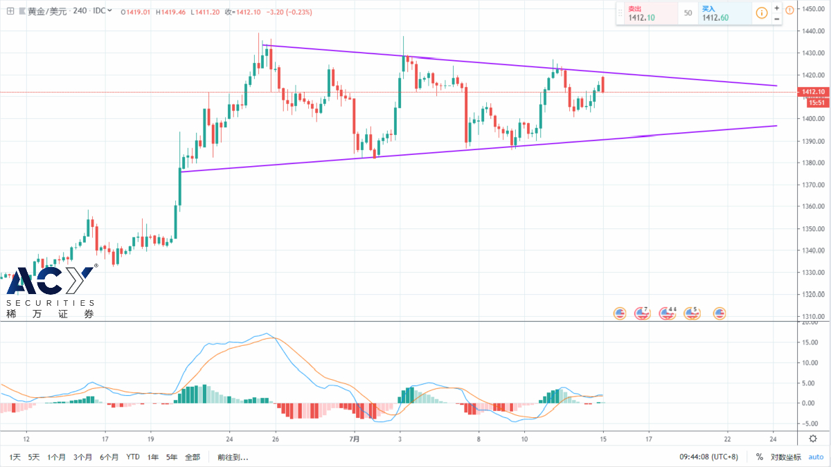 ACY稀万证券认为,黄金4小时走势表现为逐渐收敛的三角形震荡形态,若近两个交易日多头试探1420-1422区间无法突破,则后市金价可能再次回落至1390-1400区间。本周多个国家将陆续公布CPI数据,市场料将借此对全球经济增长情况进行进一步评估,虽然目前美联储宽松政策预期高胀,且日线级别以上利多黄金技术面因素众多,但在行情未明确选择三角形突破方向前不宜过于激进选择高位买进。