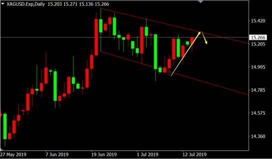 从白银日线图来看,价格反弹至下降趋势线上轨上涨乏力,上行行情即将受阻,多单应考虑获利了结。