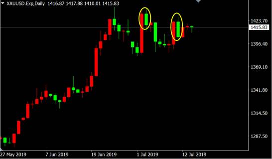 从国际黄金日线图来看,上周鲍威尔鸽声一出,各大市场瞬间暴动:国际黄金连破1400、1410和1420三大关口;价格上涨末期不断高位出现看跌乌云盖顶K线形态,短线获利丰厚,多单应考虑及时获利了结。