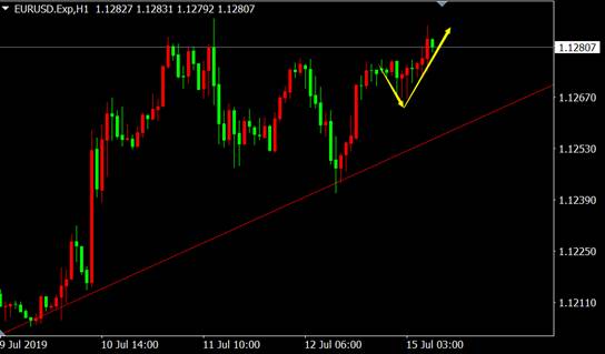 从欧元兑美元1小时图来看,价格沿上涨趋势线震荡上行即将突破前期高点,上涨空间再度被打开。