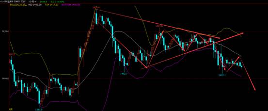 艾德证券期货研究部:黄金昨日我们建议投资者关注三角形的末端突破方向,结果黄金选择了向下突破,目前报价为1405美元/盎司左右,空单已经盈利近8美元/盎司,空单可以继续持有,目前黄金短线走弱,昨日未介入做空的可以考虑COMEX8月期金反弹至1408美元/盎司做空,止损设置为:1413美元/盎司。