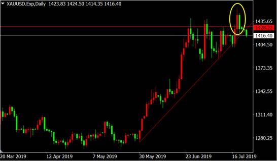 从国际黄金日线图来看,黄金三角形整理形态过后价格向上突破再次创出新高,然立即引起空头反扑,高位出现吞没看跌K线形态,多单应考虑逢高获利了结。