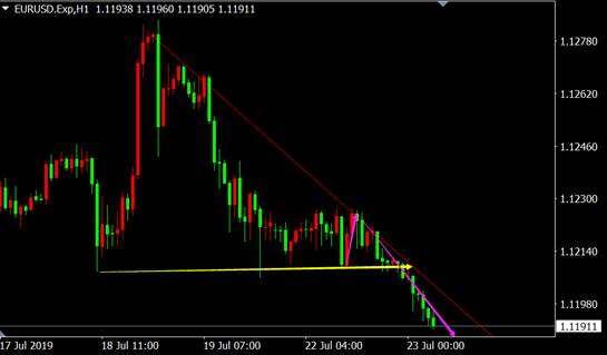 从欧元兑美元1小时图来看,价格受下降趋势线压制且反弹无力形成看跌三角形形态,价格创出新低空头趋势再度开启。