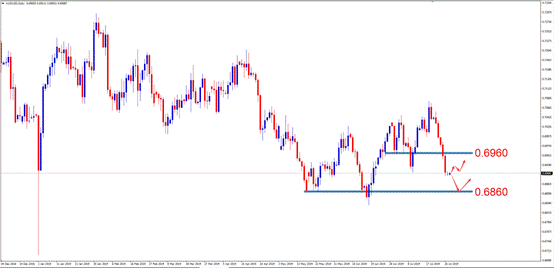 技术点评:D1周期中,澳元连续收大阴线实体下挫,价格屡屡跌破关键支撑位,后市或持续走软至0.6860前低附近。
