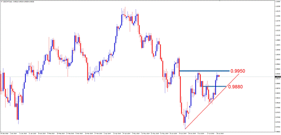 交易策略:激进的投资者可考虑0.9880附近轻仓做多,止损0.9830附近,目标0.9950附近。