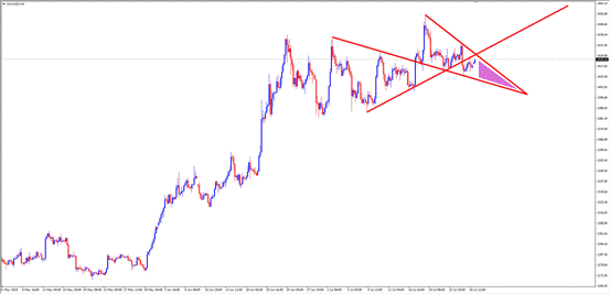 技术点评:H4周期中,金价高位震荡调整,当前依然受制于下降趋势,短期内保持三角形内部震荡调整。