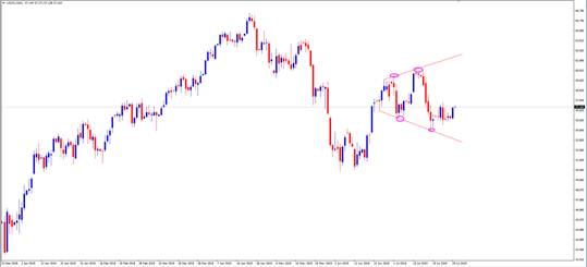 备选策略:澳元日线图价格处于下行阶段,当前无明显企稳迹象,看多需谨慎对待。