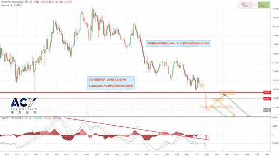 技术面分析,英镑兑美元连续三日收出大阴线,沿着MA5均线下行,且角度较大,预示着空方力度强劲,且汇价已经跌破1.2400重要关口,下一重要支撑位则是数年低点1.2000附近。不过从两小时级别来看,镑美空头宣泄还在延续之中,汇价若能反弹到1.2215下方,且不超过1.2215,空单可轻仓入场。日线级别镑美上方压力位1.2300、1.2400,若汇价出现反弹,不能有效突破压力位则是空单最好的入场时机。