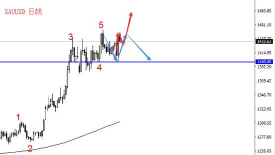 昨日避险情绪的飙升推动黄金的上涨,从周期来看,蓝色趋势概率更大,目前黄金仍需要盘整段时间才能冲击更高的价格。但若今晚非农数据不及预期,不排除市场对此过度解读,如红色箭头趋势破位今日高点。