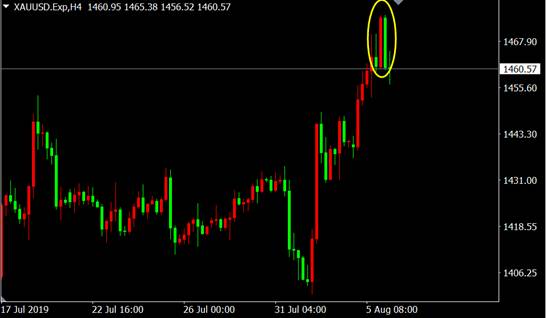 因特朗普对国际贸易局势的相关言论,推送了市场的担忧情绪,再加上ISM制造业PMI数据放缓至近三年低点,黄金避险买需激增,且从国际黄金4小时图来看黄金上涨末期出现吞没看跌K线,黄金多头遭遇当头一棒多头应先落袋为安。