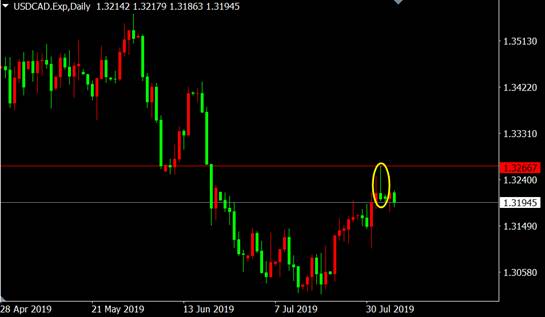从美元兑加元日线图来看,价格触底反弹至前期压力区附近出现上吊线看跌K线形态,反弹将终结。多单应获利了结。