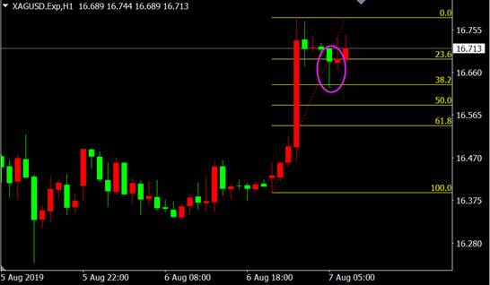从白银1小时图来看,价格回调至38.20%的位置出现锤子线看涨K线形态止跌,若价格再次突破新高,那么上涨行情将再度开启。