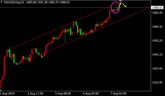 因特朗普对国际贸易局势的相关言论,推送了市场的担忧情绪,再加上ISM制造业PMI数据放缓至近三年低点,黄金避险买需激增,且从国际黄金1小时图来看金价运行至上涨趋势通道上沿附近,且出现上吊线看跌K线形态,金价短期有回调需要,多单应考虑及时获利了结。