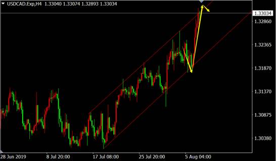 从美元兑加元4小时图来看,价格运行至上涨趋势通道上沿附近有回调需要,多单应考虑及时获利了结。