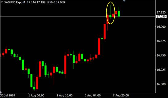 从白银4小时图来看,价格在高位出现上吊线K线看跌形态,白银短线有回调需要,多单应考虑获利了结。