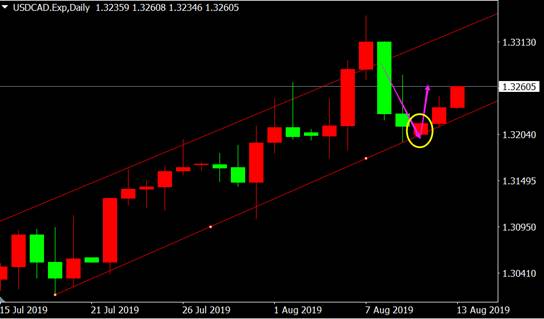 从美元兑加元日线图来看,价格回落至上升通道下轨出现孕线看涨K线形态,多头将再度展开行情。