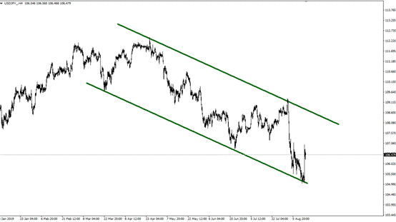 昨夜中美磋商牵头人进行了通话,避险情绪快速消退导致美元兑日元直线拉升超过100点。而随后美国贸易办公室称将部分9月1号的征税推迟到12月。双方又获得了3个月的缓冲时间。料推动USD/JPY上行。目前USD/JPY运行至通道底部,有望回升。