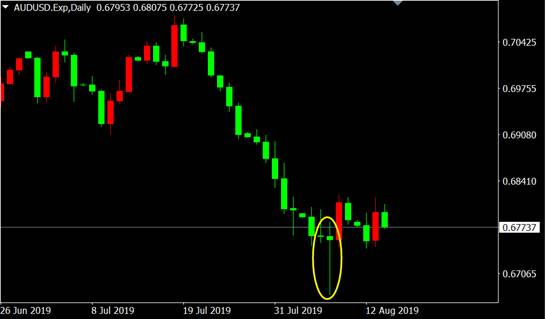 从澳元兑美元日线图来看,价格跌至末期出现锤子线看涨K线形态,反弹行情即将展开,空单可以考虑逢低获利了结。