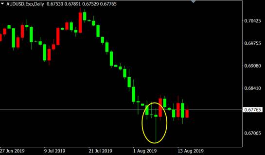 从澳元兑美元日线图来看,价格跌至末期出现锤子线看涨K线形态,反弹行情即将展开,空单可以考虑逢低获利了结。