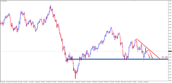 技术点评:D1周期中,上周油价在测试下降趋势线附近后承压下行,本周大概率继续下跌,测试51.00强支撑。