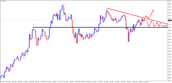 技术点评:D1周期中,英镑依然处于空头格局当中,上周价格测试趋势线后顺势下跌,本周仍需保持空头思路。