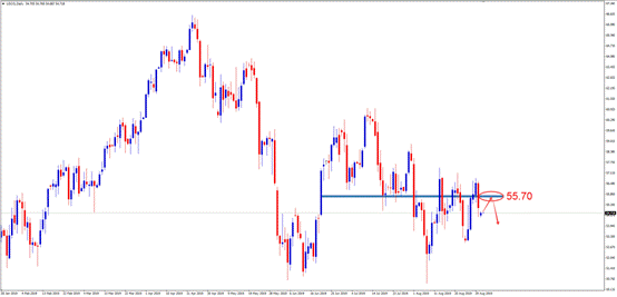 交易策略:建议投资者可考虑55.70附近做空,止损56.80附近,目标53.60附近。