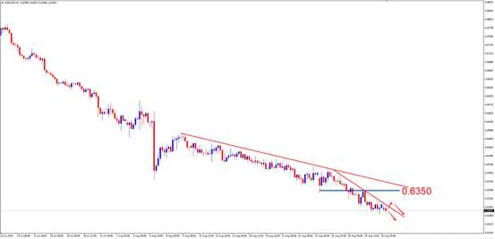 交易策略:短线投资者可考虑于0.6350附近做空,止损0.6400附近,止盈0.6280附近。