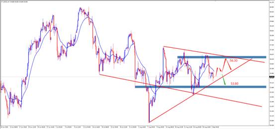 技术点评:H4周期中,原油处于横盘整理态势,目前大周期三角震荡走势,建议投资者关注调整震荡区间53.80-56.30的震荡机会。