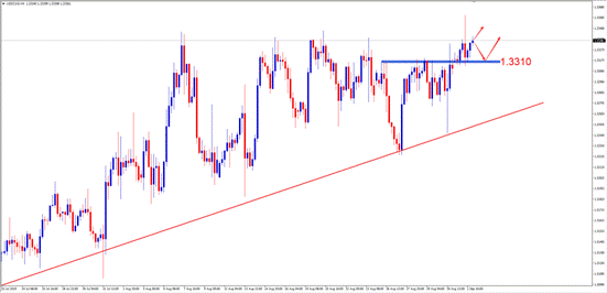 交易策略:激进投资者可尝试于1.3310附近做多,止损1.3280附近,止盈1.3420附近。