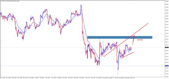 技术点评:H4周期中,价格仍处于震荡上行走势,短期或延续上行至高位106.90上方,建议投资者关注回调做多的交易机会。