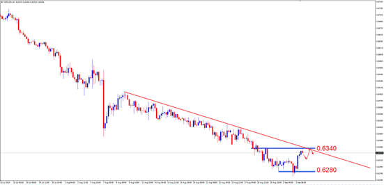 交易策略:激进投资者可考虑于0.6340附近做空,止损0.6380附近,止盈0.6280附近。