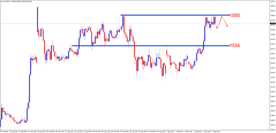 技术点评:H4周期中,隔夜价格突破1533压力位后快速拉升走强,短线试探至前期高点1550附近的压制效果。