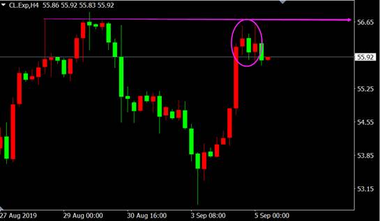 从WTI原油4小时图来看原油价格反弹至前期压力区附近出现双针探顶的看跌K线形态,多单应考虑及时获利了结。
