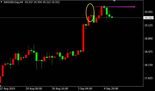 从白银4小时图来看,价格高位出现上吊线看跌K线形态,行情再次上冲仍没有有效突破新高,上涨行情恐将暂告一个段落,多单应考虑及时获利了结。
