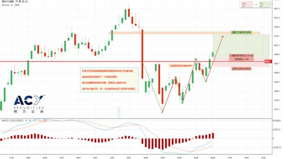 技术面分析,澳大利亚标普指数继续延续反弹态势,符合我们近期做出“若6500点支撑有效,反弹目标位将延续至6630/6700”的预判。不过,股指60分钟走势图来看,8月6日开启的底部震荡箱体颈线位6600处已经被突破,此处将转化为股指下一个有效支撑位。但是由于股指临近8月5日首次破位下跌的中阴线1/2位置6700左右的压力位,预计后期指数将稍作休整,再度向上测试该位置的压力力度。若6700点被打开,进一步反弹目标位将上移至6768附近。因中美贸易谈判将于十月中旬启动,短线不易看空本轮6400点起始的反弹行情。
