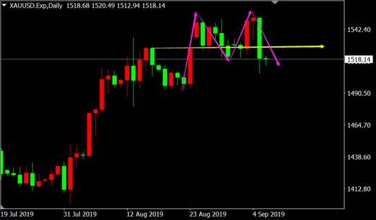 从国际黄金日线图来看,价格两次上冲都没有突破新高并形成平头顶看跌K线形态,其后吞没看跌K线更是绝了多头反攻的希望,多头行情暂告一个段落,多头应及时获利了结。