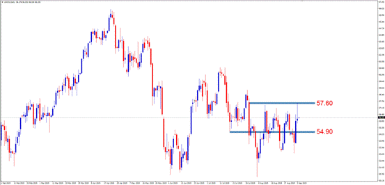 交易策略:激进的投资者可考虑54.90-57.60区间高抛低吸,止损100点左右,目标200点左右。