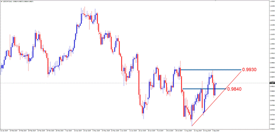 交易策略:激进的投资者可考虑0.9840附近做多,止损0.9790附近,止盈0.9930左右。