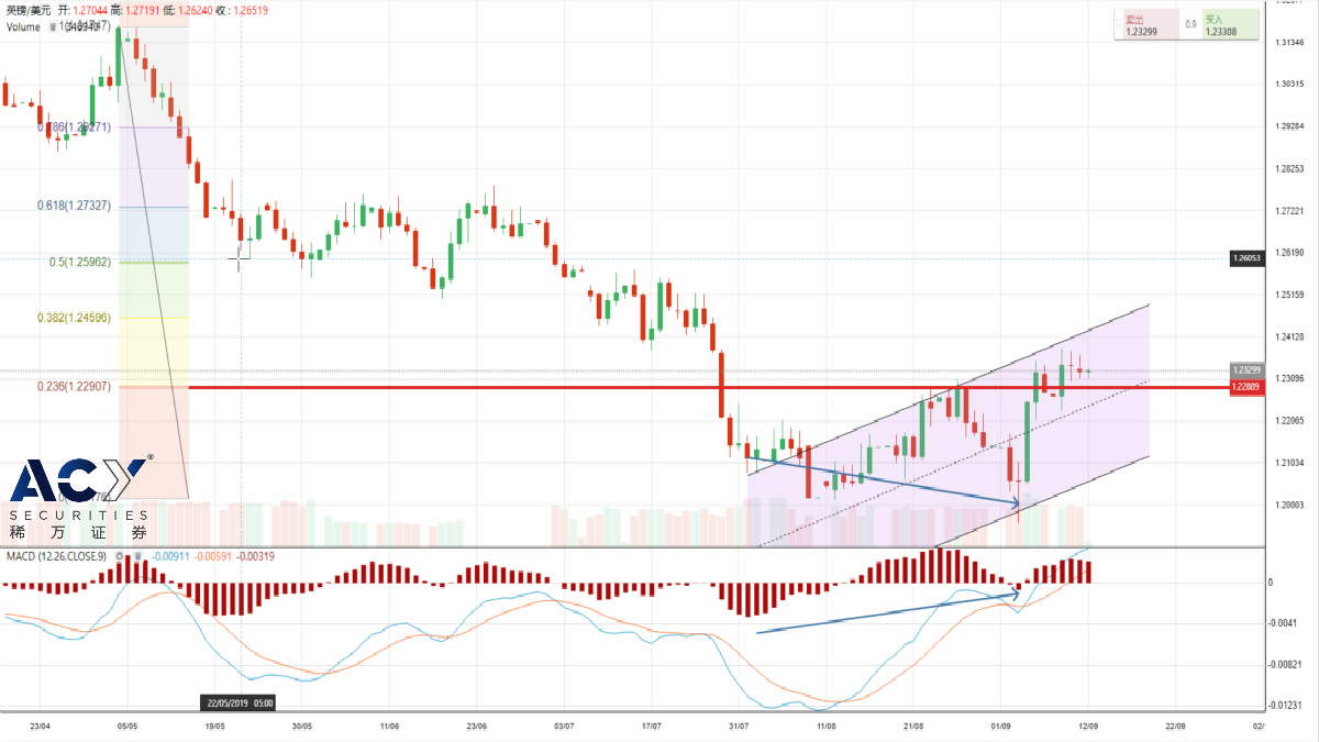 在市场排除英国央行降息的可能后汇率并未继续拉升,反应出目前市场已缓慢转弱,硬脱欧担忧缓解给英镑带来的利好虽起到支撑,但利好刺激市场买入的作用已稍不如从前。最新民调显示,英国保守党内部大部分人士支持强硬脱欧路线,导致脱欧大限虽然再度延长三个月,但无协议脱欧风险依然存在。此次英镑汇率大幅反弹技术面动力源自于低位MACD指标背离,目前背离满足目标价位已经达到,因英镑汇率尚未出现明显反转迹象,后市多头可能会再次尝试冲击近一个月以来的高点1.23836,不过在技术面动力储备不足和基本面风险依旧的背景下,英镑短线冲高的举动恐难以持续,汇率若在小幅刷新高点1.23836之后无法成功持稳于该点位上方,则后市英镑可能退守至1.22570附近支撑位。