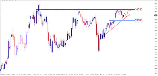技术点评:D1周期中,价格维持多头高位整理,短期承压于14050强压力位,激进投资者可尝试于该位置布局空单机会。