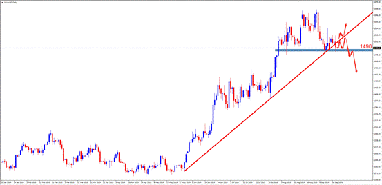 技术点评:D1周期中,受基本面因素影响,晚间金价跌破上升趋势线,当前正测试水平支撑带。