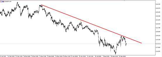 欧央行行长德拉吉在欧洲议会经济和货币事务委员会时发表的讲话符合这一预期。德拉吉称,“制造业疲软持续的时间越长,经济放缓将影响其他经济部门的风险越大”,制造业指标未出现“令人信服的信号表明在不久的将来会出现反弹”。“欧央行会在通胀前景许可的情况下使用所有工具”。这表明欧洲经济的放缓远远没有到达触底的地步,昨日的德国法国PMI进一步下跌加重了这一点。EUR/JPY更能反映这一点,价格触碰到红色上涨趋势线后恢复下跌势头,朝着116.10前进。