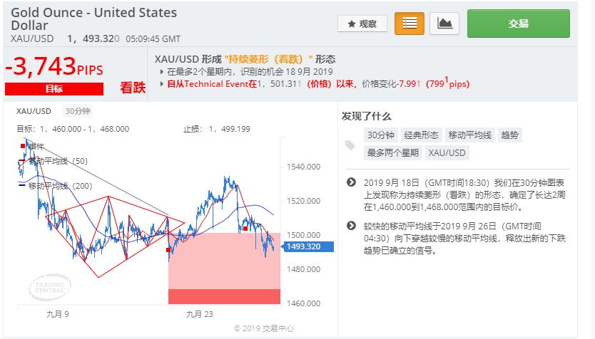 而GKFXPrime提供的Recognia分析工具显示黄金看跌,在30分钟图表上发现称为持续菱形(看跌)的形态,确定了长达2周在1,460.000到1,468.000范围内的目标价。