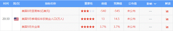 周五(10月4日)晚间20:30,美国劳工部将公布美国8月份非农就业报告,目前市场预期就业人数增加14.5万人,高于前值的13万人,失业率料仍维持3.7%不变,同时薪资增速仍是市场关注焦点。