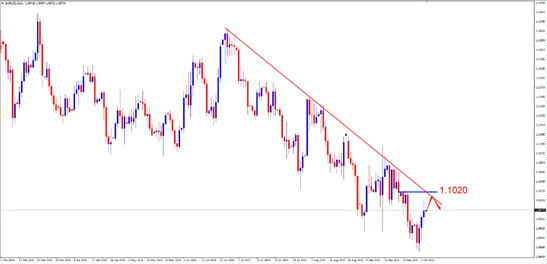 技术点评:D1周期中,欧元日线图收小K线反弹走强,短线或往上测试1.1020附近的压力效果。