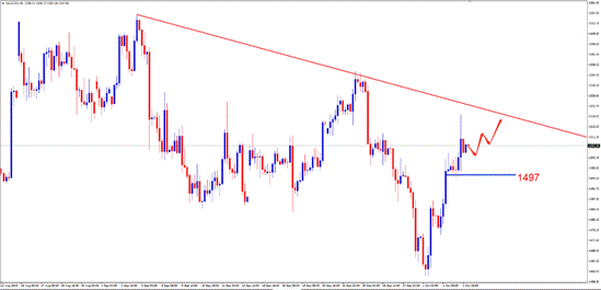 技术点评:H4周期中,隔夜黄金连续拉涨突破1511压力关口,短线或持续鼓励看涨至上方压力区域。
